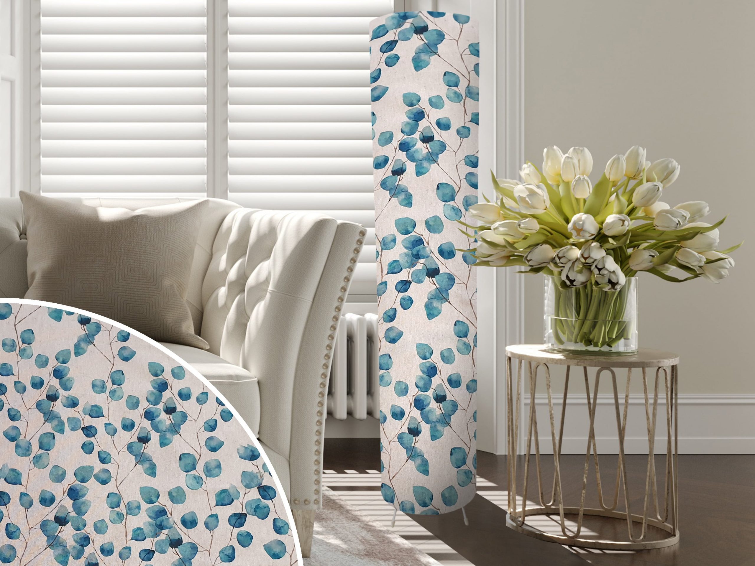 A stylish botanical design makes this honesty teal floor lamp a perfect addition to your modern country home interiors. Our floor lamps feature a beautiful patterned exterior climbing honesty leaves in teal set against a neutral beige background; simple yet elegant. The fabric is backed onto a lampshade specific white PVC designed to provide reflect light internally to ensure the floor lamp will be well illuminated.